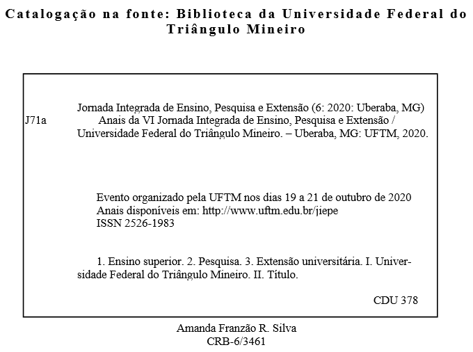 III - Os autores devem se atentar às normas de elaboração dos resumos, bem como evidenciar o seu carÔter extensionista, para além do Ensino e da Pesquisa. Importante destacar que resumos que não atenderem a esses critérios serão recusados, mesmo que o projeto ou programa que lhe deu origem seja aprovado em edital da PROEXT;