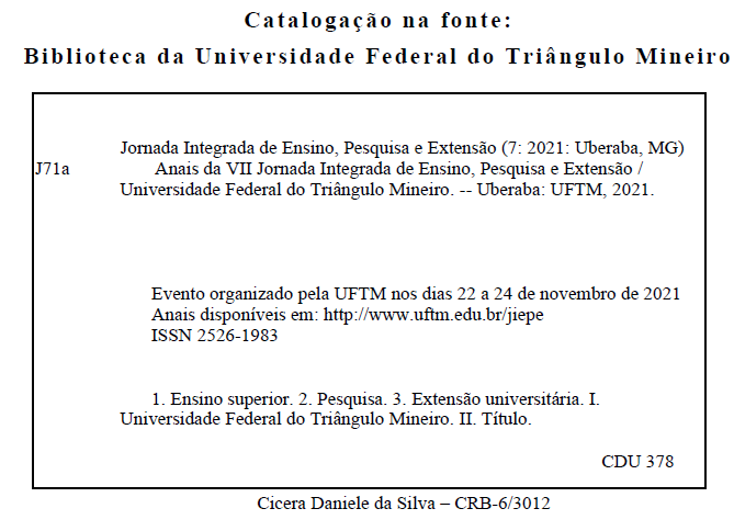 c) No caso de Projetos de Ensino o autor deve estar devidamente indicado no Projeto submetido e aprovado no Sigproj Ensino ou no Sistema UFTMNet.