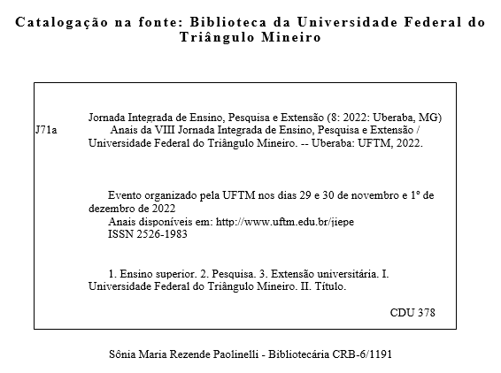 1. Os resumos da Ć”rea āEnsinoā somente poderĆ£o ser submetidos se estiverem devidamente registrados em algum Programa gerenciado pela Pró-Reitoria de Ensino da UFTM ā PROENS (Monitoria, PET, PIBID, ResidĆŖncia Pedagógica). TambĆ©m serĆ£o aceitos resumos relacionados a atividades de EstĆ”gio, Mobilidade AcadĆŖmica e Projetos de Ensino, este Ćŗltimo, desde que devidamente registrados no Sistema UFTMNet.